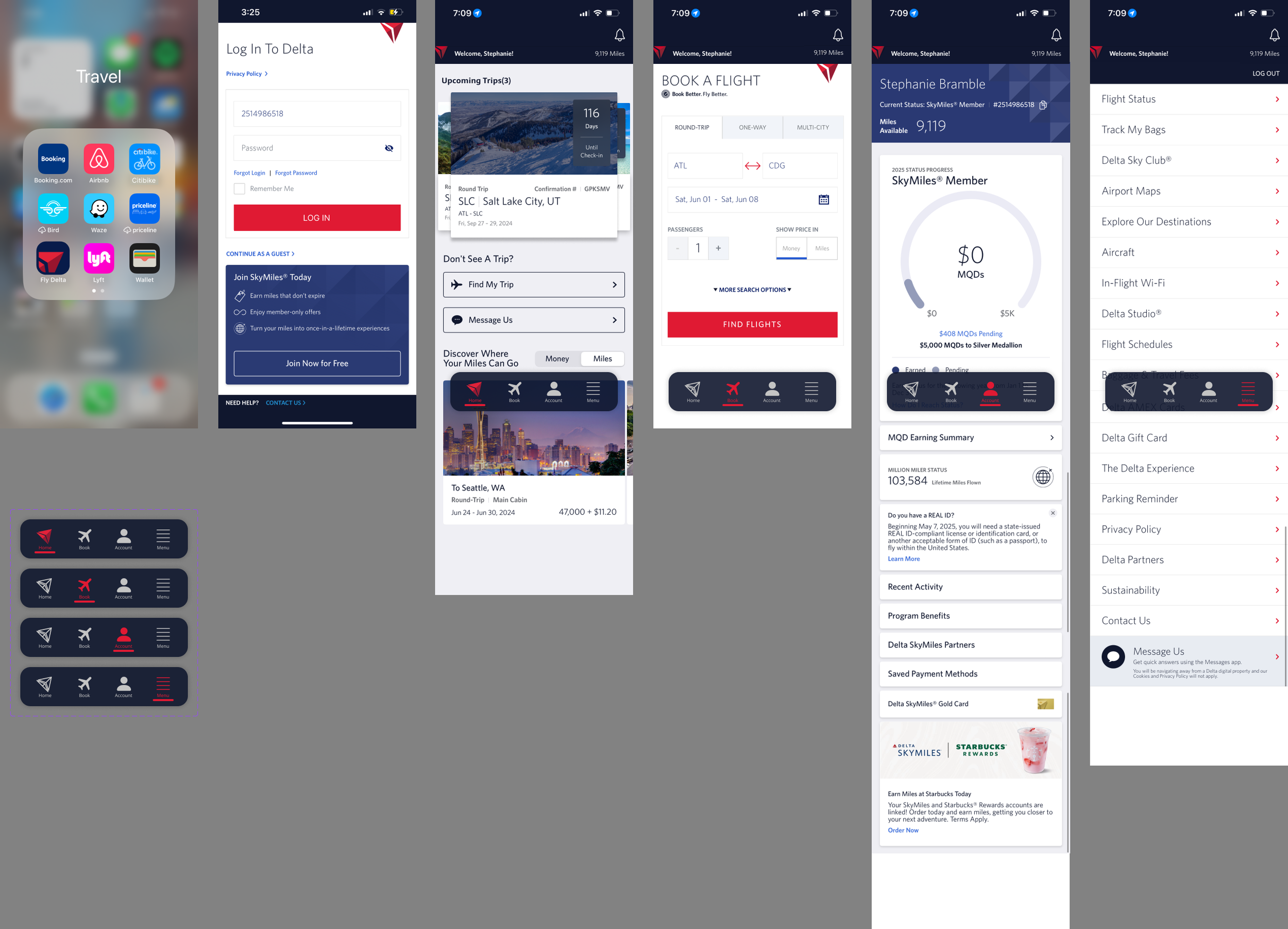 These questions can all be answered from 2 out of the 5 current pages in the current Fly Delta mobile app: Trips and Accounts.