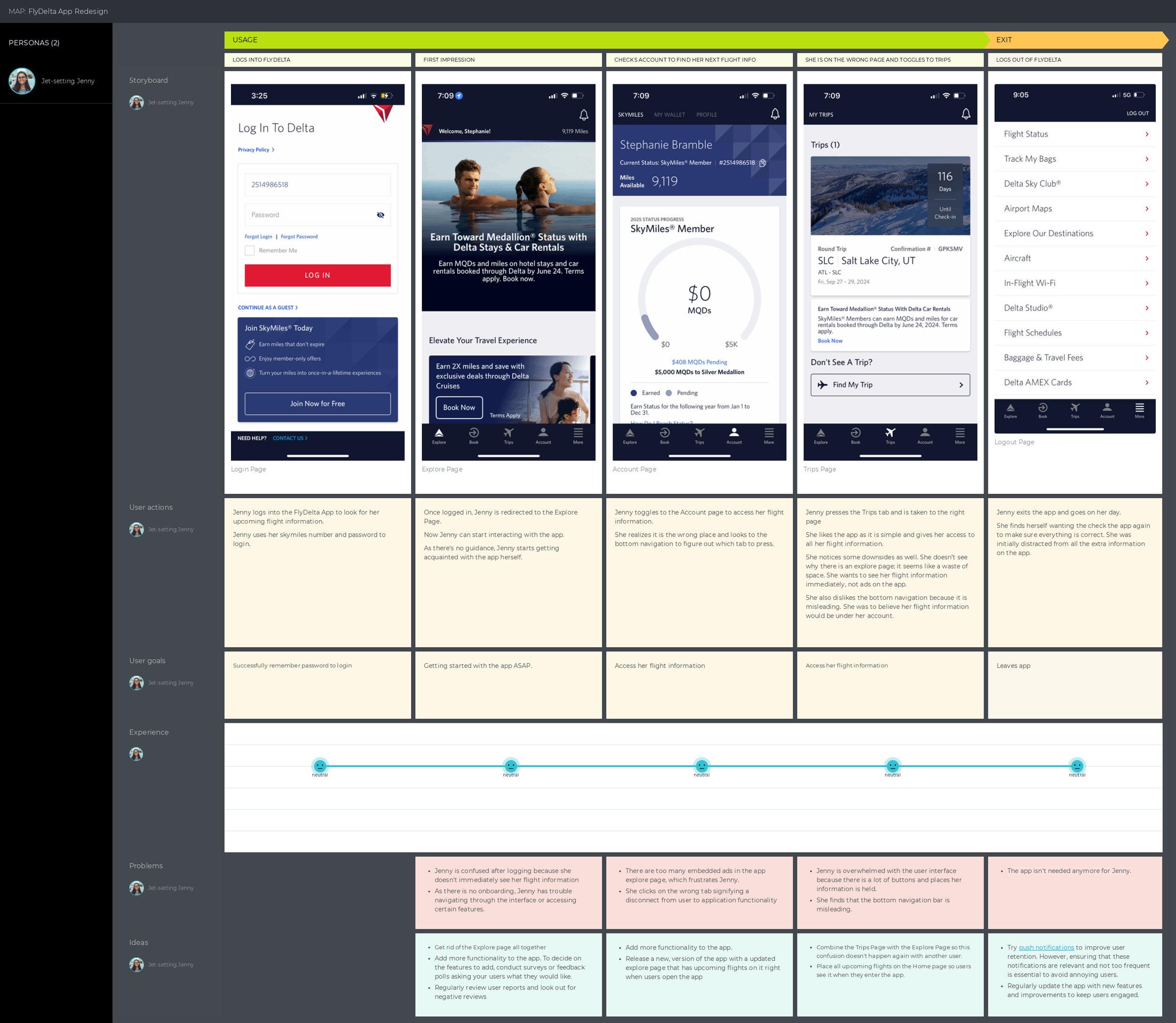 When creating my customer journey map, I decided the best way to showcase Fly Delta’s inconsistencies was to show the app in it’s current state. I wanted to show it like this because seeing Jenny’s struggles is a powerful representation of the lack of empathy the Fly Delta app has for their users. It only takes 1 or 2 users to have a problem to know that other people are experiencing these issues as well.