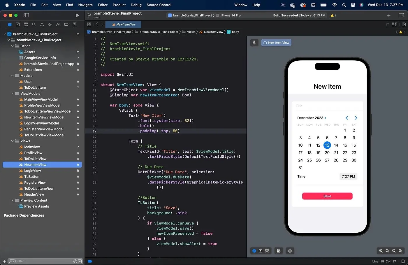 The development process involved creating a smooth user experience through SwiftUI, ensuring easy navigation for customers. The project utilized a modular approach, with various SwiftUI files seamlessly connecting to Swift files, organized into three distinct folders: Other, Models, and ViewModels. This organizational structure aimed to maintain clarity and order throughout the development process.